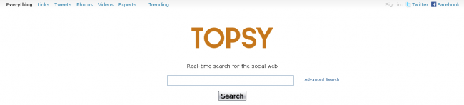 - Topsy tiene la apariencia de un típico buscador, con la diferencia de que permite buscar todos los tweets que se han realizado desde una cuenta de Twitter y las menciones que se han hecho. Los resultados se nos presentan por semana o mes. Accediendo a una de esas pestañas podremos conocer quién nos ha mencionado y evaluar un poco el efecto viral de nuestras publicaciones en Twitter. También permite filtrar tweets que contienen links, fotos o vídeos. Además podremos ordenar tweets y menciones por fecha o por relevancia.
