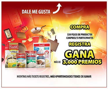 Campbell's México, una empresa con poco más de un siglo de presencia en el país, acaba de lanzar su campaña “Con Campbell’s siempre ganas”, aprovechando las redes sociales (Facebook y Twitter en este caso) como canal de difusión del concurso. La campaña busca incentivar a los usuarios de las redes a participar en el concurso, así como resolver todas sus dudas y comentarios sobre la dinámica del mismo. La dinámica de la campaña es sencilla: Compras, te registras y ganas. Por la compra de $30 pesos de productos Campbell’s, podrás registrar tu número de ticket de compra para poder ganar miles de premios.