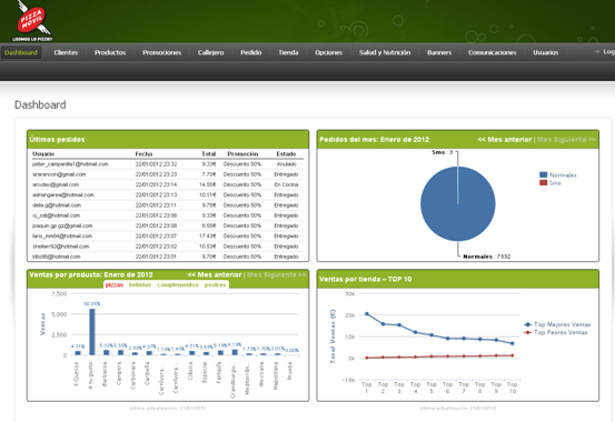 Todo esto no sería posible sin una zona de administración que sirve tanto para monitorizar los pedidos que van entrando como configurar productos (pizzas, bebidas, ingredientes …), locales (callejeros, horarios, …) y otros contenidos del site.