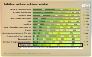 ¿Para qué usa ese 21% de españoles su tablet? Según el mismo estudio, la actividad menos recurrente es precisamente la compra online: un 8% compra online a diario, un 14% lo hace semanalmente y un 17% lo hace al menos una vez al mes.