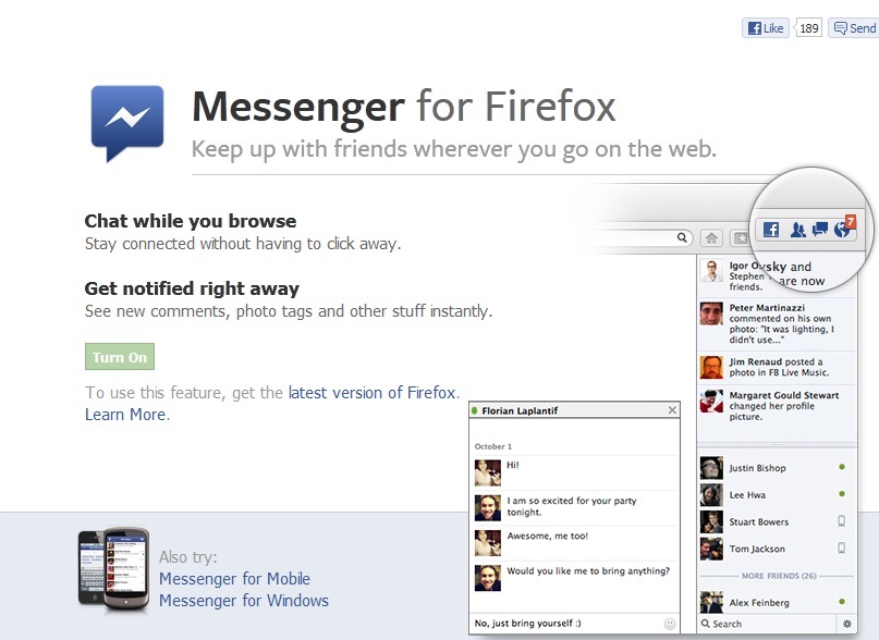 El primer servicio en probarlo ha sido el sistema de mensajería de Facebook, Facebook Messenger y ya está disponible para la actual versión 17 Beta. La integración de Facebook Messenger realizará algunos cambios en el navegador, entre ellos, añadir una barra lateral persistente con el famoso ticker y la lista de contactos para poder comunicarnos mediante mensajería directa (como se puede hacer normalmente dentro de su página web). Es decir, puede seguir navegando libremente y este servicio de mensajería siempre estará disponible. No es necesario que mantenga una pestaña desplegada en la que se aloje la web de Facebook. Además añade cuatro nuevos botones en la barra de navegación que facilitan acciones como compartir o "me gusta" y que se podrán utilizar en cualquier página (aunque esta no tenga los botones embebidos).
