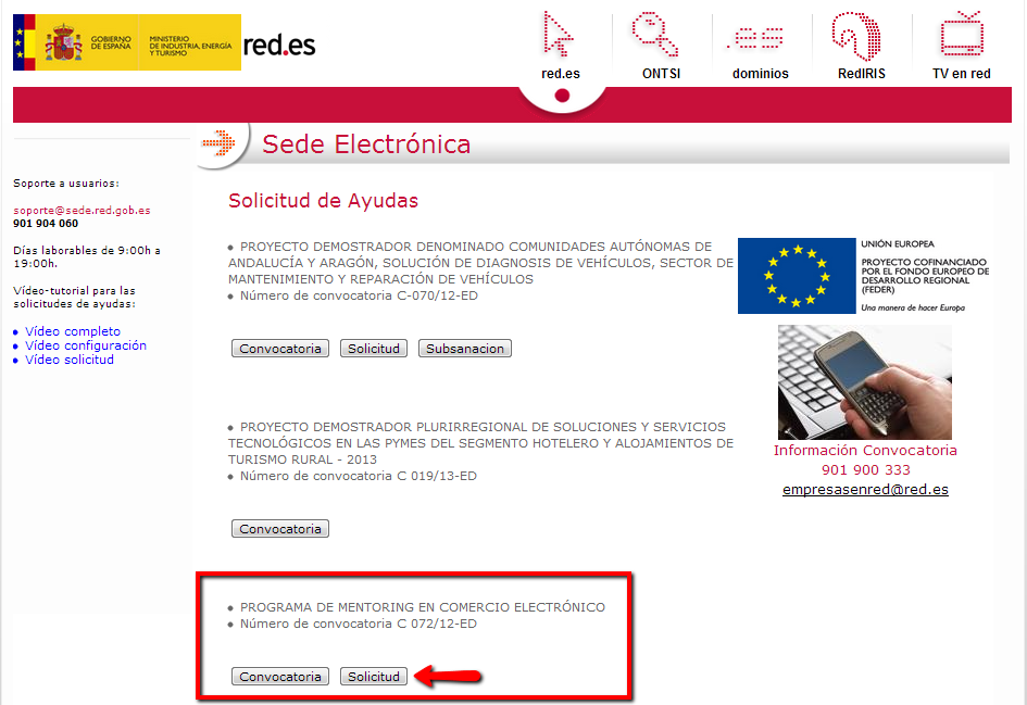 - A continuación llegarás a la sección de la "Convocatoria del Proyecto Demostrador denominado: PROGRAMA DE MENTORING EN COMERCIO ELECTRÓNICO, Número de convocatoria C 072/12-ED "