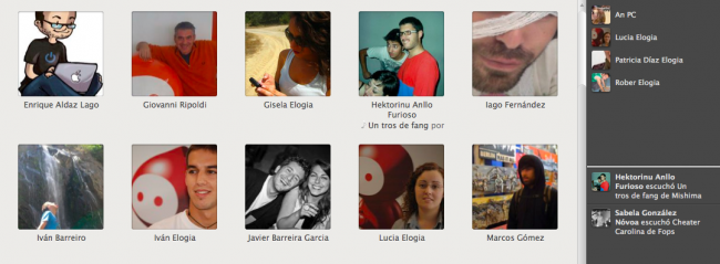 Spotify sigue la moda del ticker introducida por Facebook, e integra en la parte inferior derecha un espacio que muestra las canciones que están escuchando en todo momento nuestros amigos de Facebook (si tenemos la cuenta sincronizada, y de momento sólo se muestran los que tienen la versión beta de Spotify instalada). En esta nueva versión, la lista de amigos pasa a ser pestaña propia a la que se accede a través de la barra de navegación izquierda, con una nueva visualización de todos nuestros contactos en un grid en el que se muestra también la última canción que han escuchado, pero también se ofrece la posibilidad de crear una lista de usuarios favoritos que aparecerá en todo momento en la parte superior derecha de la aplicación, para tenerlos más a mano.